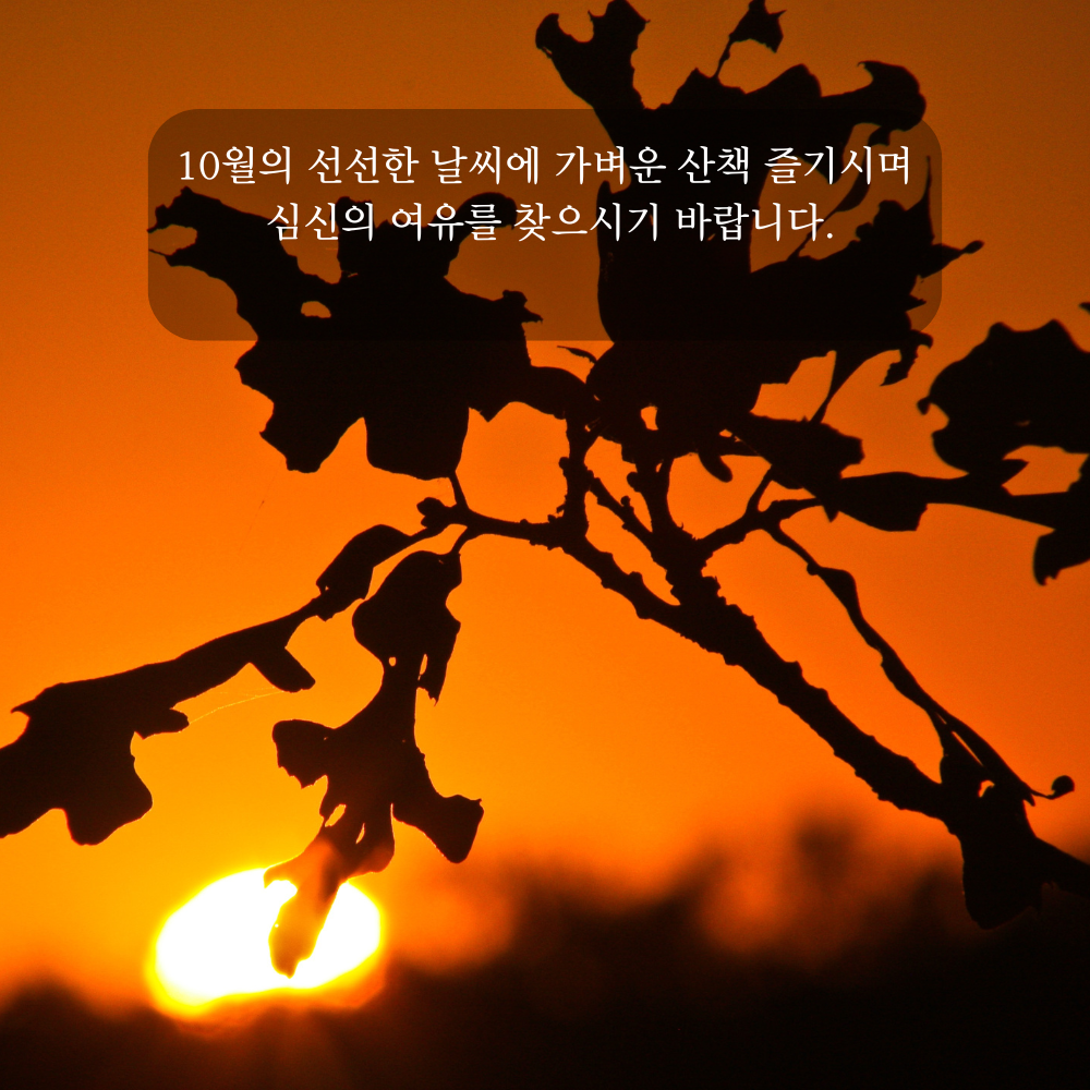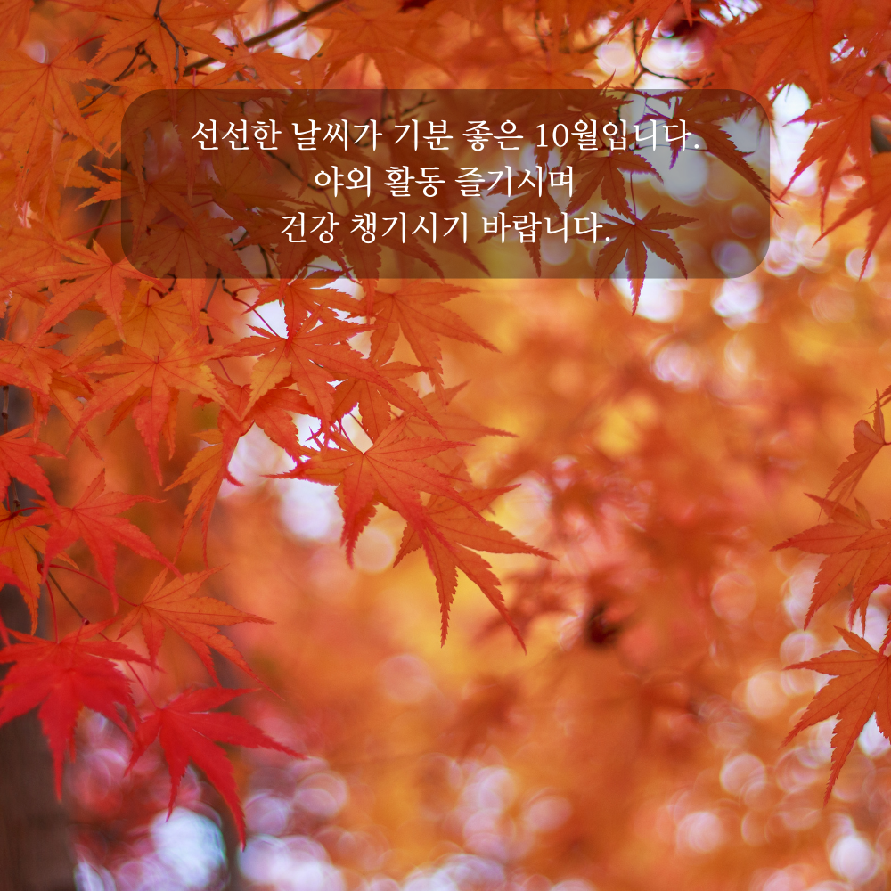 11. 선선한 날씨가 기분 좋은 10월입니다. 야외 활동 즐기시며 건강 챙기시기 바랍니다.