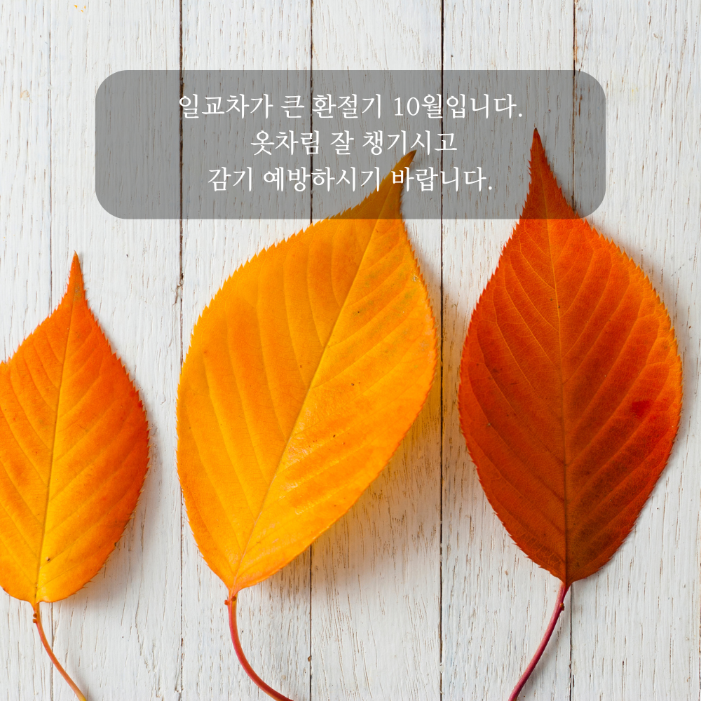 17. 일교차가 큰 환절기 10월입니다. 옷차림 잘 챙기시고 감기 예방하시기 바랍니다.