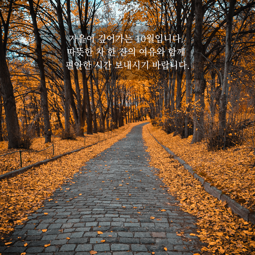 9. 가을이 깊어가는 10월입니다. 따뜻한 차 한 잔의 여유와 함께 편안한 시간 보내시기 바랍니다.