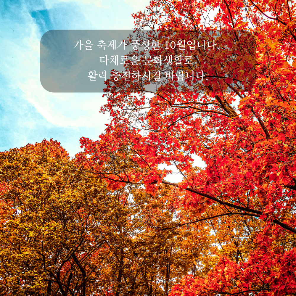 19. 가을 축제가 풍성한 10월입니다. 다채로운 문화생활로 활력 충전하시길 바랍니다.