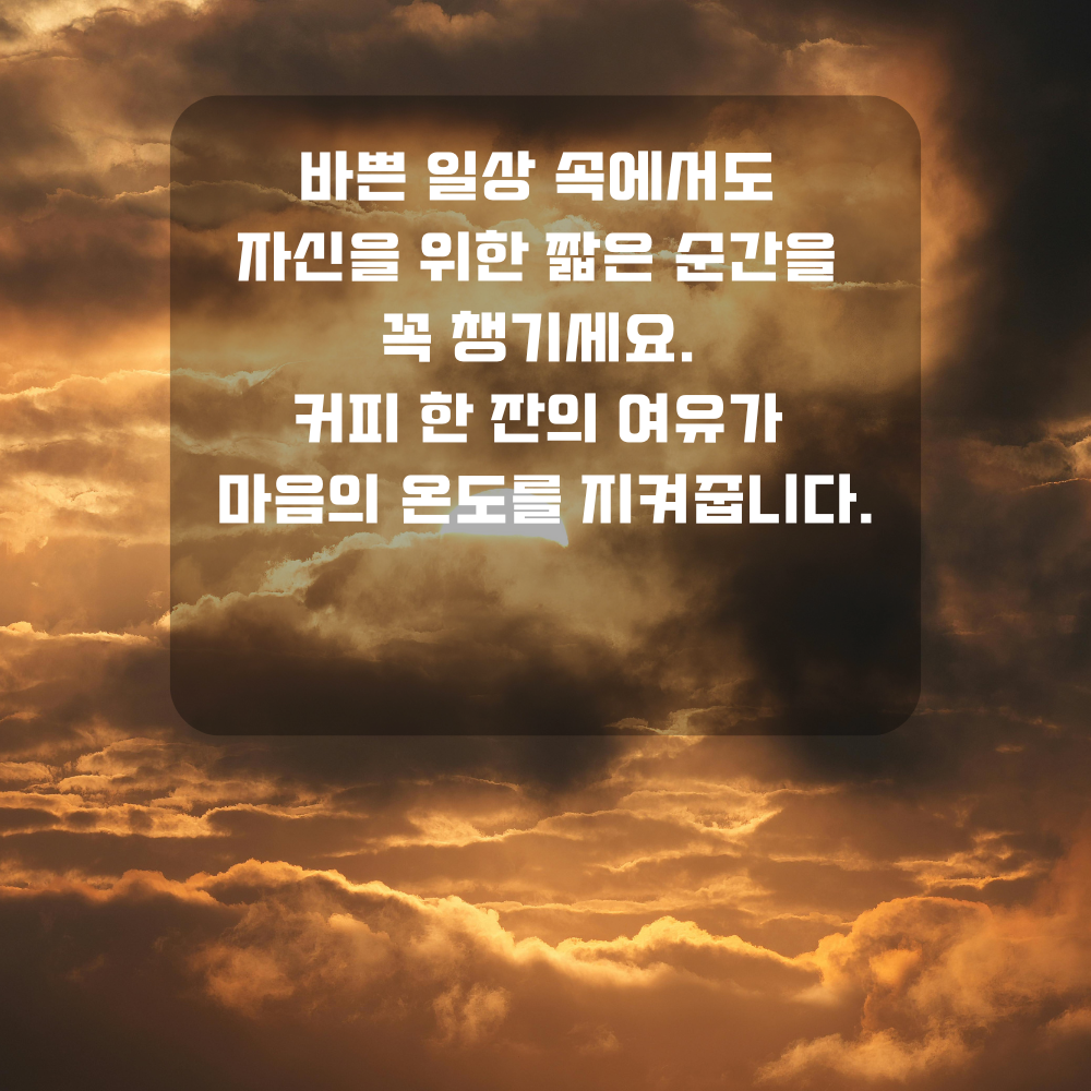 9. 바쁜 일상 속에서도 자신을 위한 짧은 순간을 꼭 챙기세요. 커피 한 잔의 여유가 마음의 온도를 지켜줍니다.
