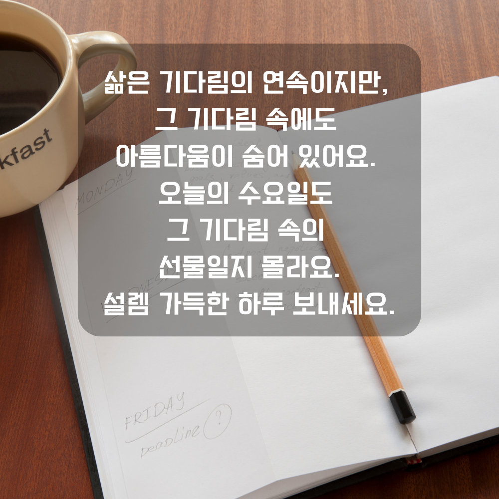 11. 삶은 기다림의 연속이지만, 그 기다림 속에도 아름다움이 숨어 있어요. 오늘의 수요일도 그 기다림 속의 선물일지 몰라요. 설렘 가득한 하루 보내세요.