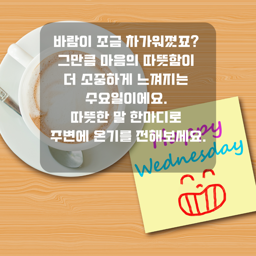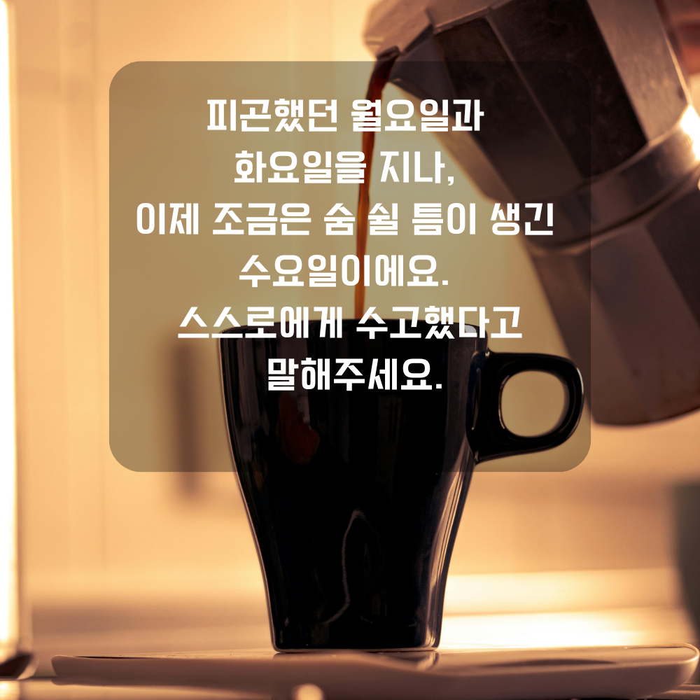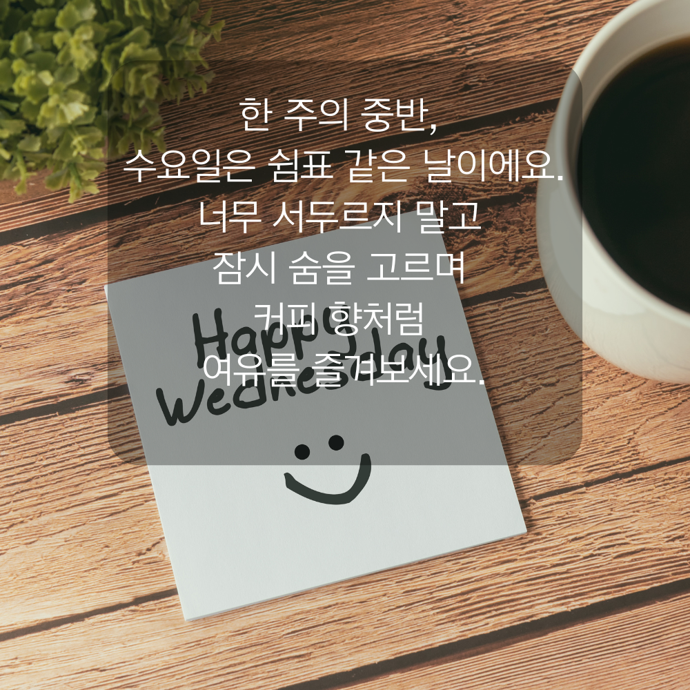 2. 한 주의 중반, 수요일은 쉼표 같은 날이에요. 너무 서두르지 말고 잠시 숨을 고르며 커피 향처럼 여유를 즐겨보세요.