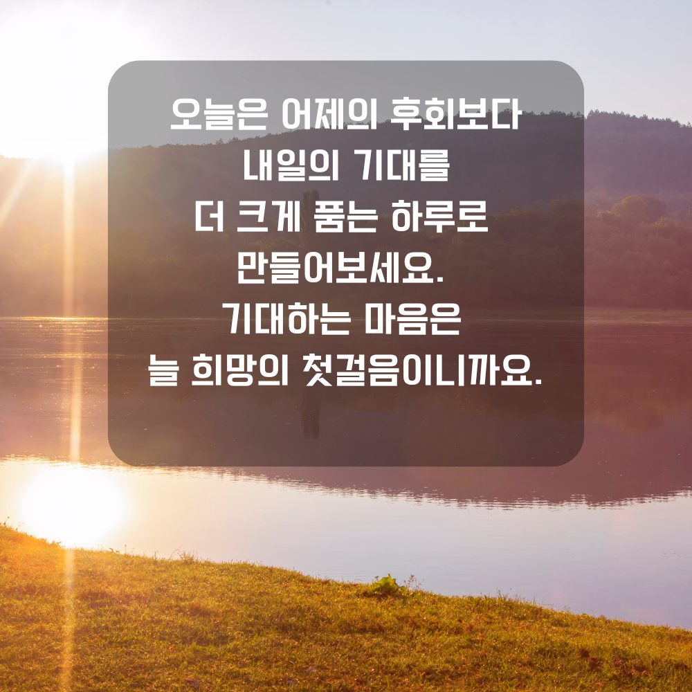 15. 오늘은 어제의 후회보다 내일의 기대를 더 크게 품는 하루로 만들어보세요. 기대하는 마음은 늘 희망의 첫걸음이니까요.