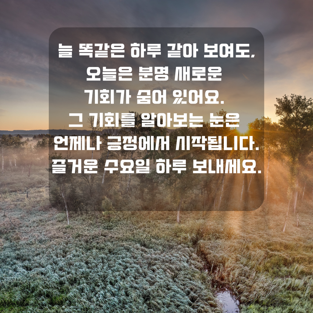 5. 늘 똑같은 하루 같아 보여도, 오늘은 분명 새로운 기회가 숨어 있어요. 그 기회를 알아보는 눈은 언제나 긍정에서 시작됩니다. 즐거운 수요일 하루 보내세요.
