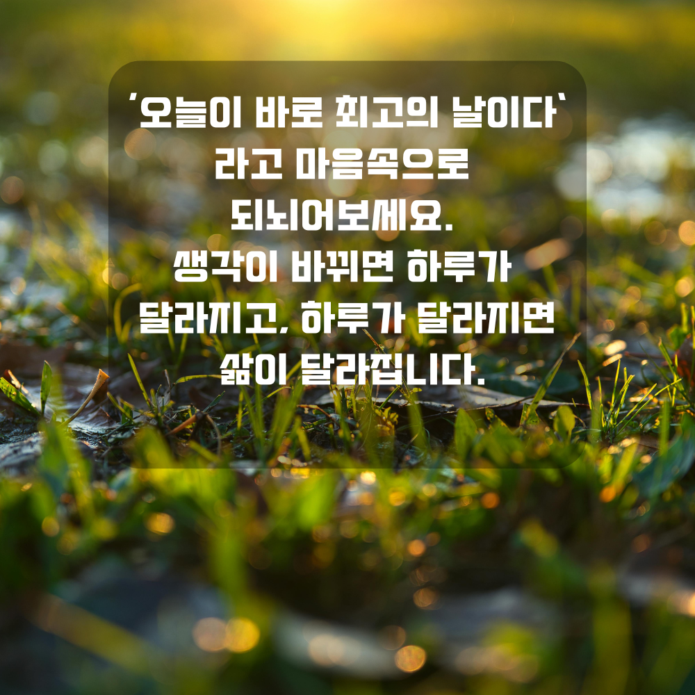 7. ‘오늘이 바로 최고의 날이다’ 라고 마음속으로 되뇌어보세요. 생각이 바뀌면 하루가 달라지고, 하루가 달라지면 삶이 달라집니다.