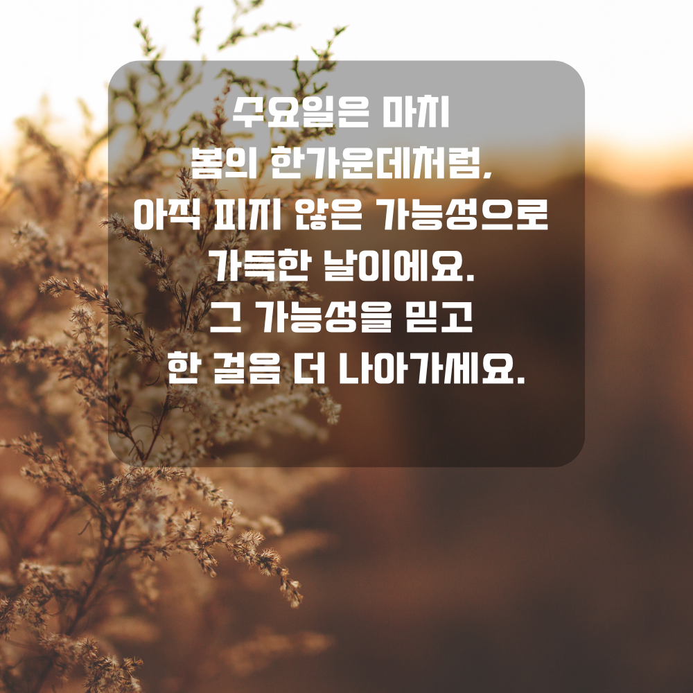 8. 수요일은 마치 봄의 한가운데처럼, 아직 피지 않은 가능성으로 가득한 날이에요. 그 가능성을 믿고 한 걸음 더 나아가세요.