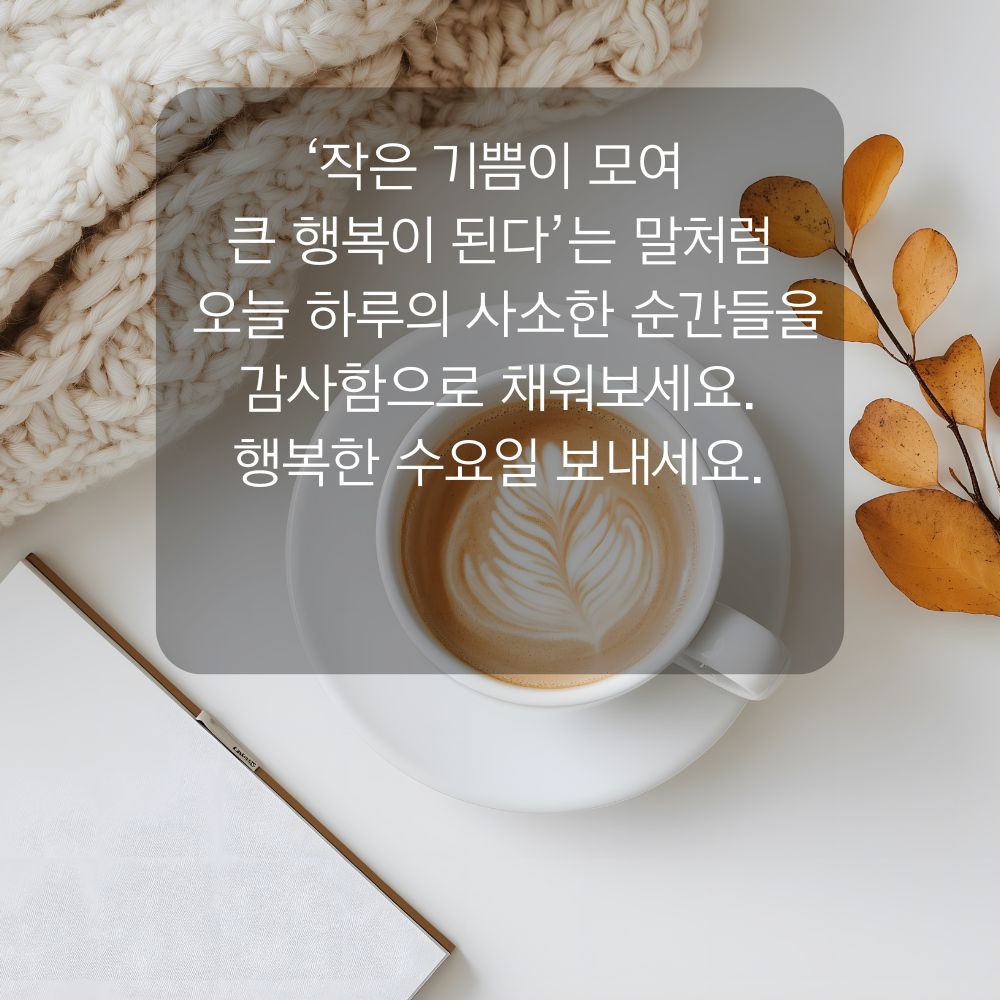 3. ‘작은 기쁨이 모여 큰 행복이 된다’는 말처럼 오늘 하루의 사소한 순간들을 감사함으로 채워보세요. 행복한 수요일 보내세요.