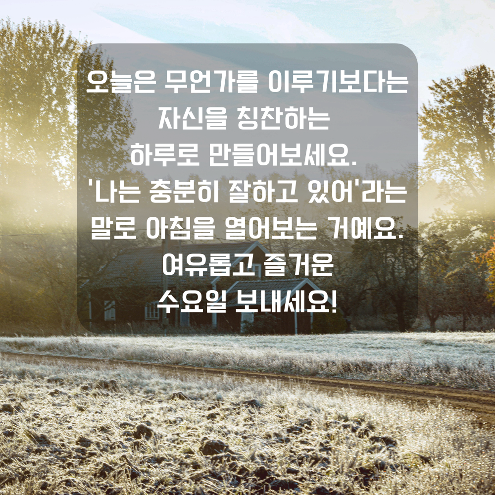 10. 오늘은 무언가를 이루기보다는 자신을 칭찬하는 하루로 만들어보세요. ‘나는 충분히 잘하고 있어’라는 말로 아침을 열어보는 거예요. 여유롭고 즐거운 수요일 보내세요!
