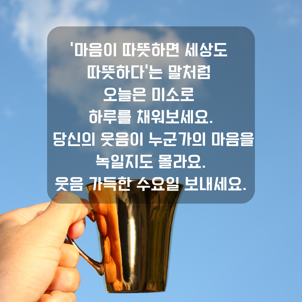 13. ‘마음이 따뜻하면 세상도 따뜻하다’는 말처럼 오늘은 미소로 하루를 채워보세요. 당신의 웃음이 누군가의 마음을 녹일지도 몰라요. 웃음 가득한 수요일 보내세요.