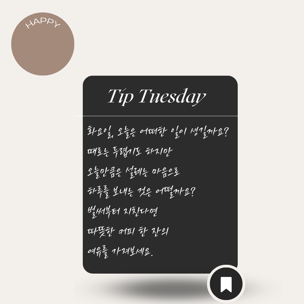 3. 화요일 팁. 화요일 오늘은 어떠한 일이 생길까요? 때로는 두렵기도 하지만 오늘만큼은 설레는 마음으로 하루를 보내는 것은 어떨까요? 벌써부터 지친다면 따뜻한 커피 한 잔의 여유를 가져보세요.