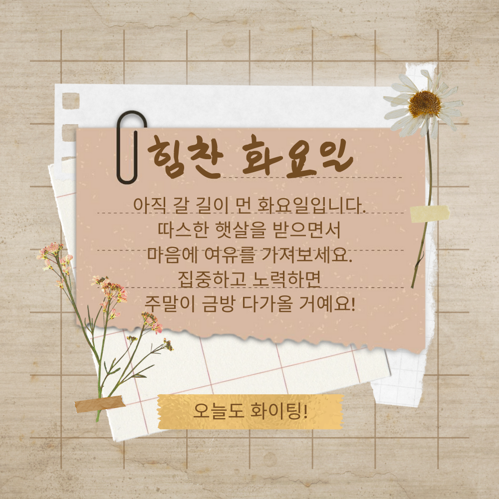 2. 힘찬 화요일! 아직 갈 길이 먼 화요일입니다. 따스한 햇살을 받으면서 마음에 여유를 가져보세요. 집중하고 노력하면 주말이 금방 다가올 거예요!
