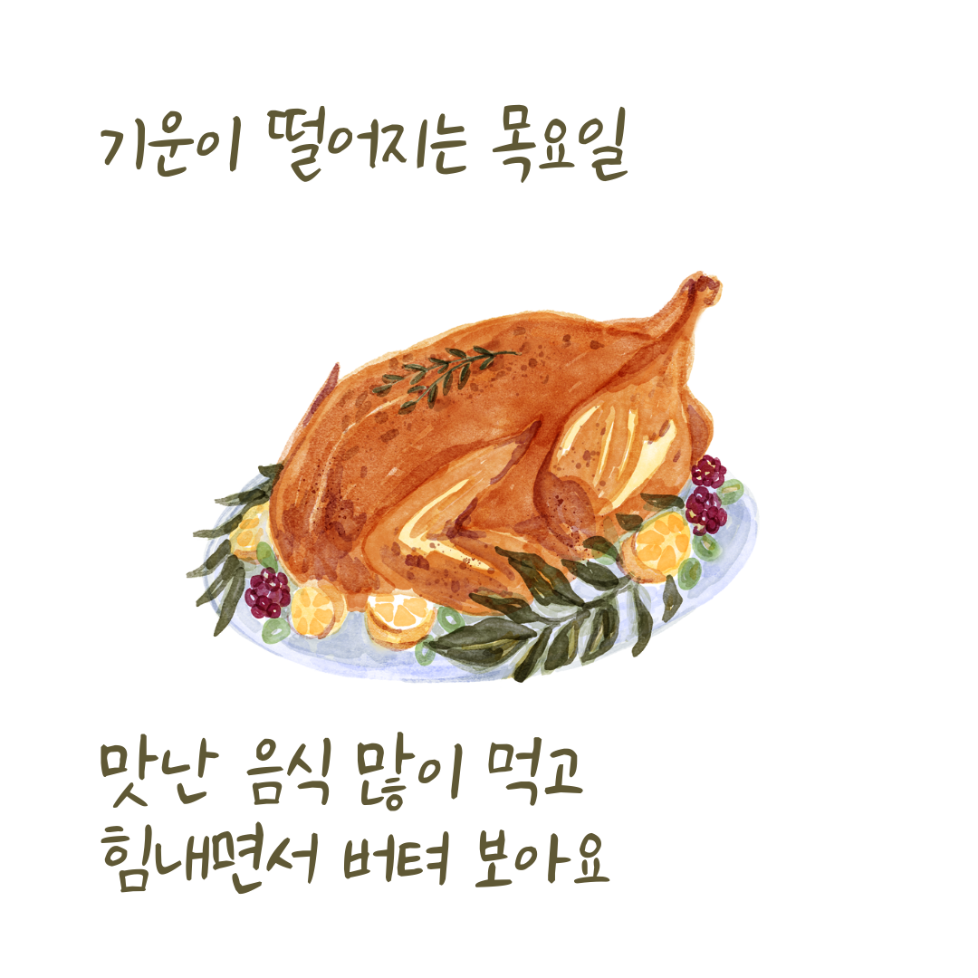 보통 목요일 저녁에 술 한잔 하지 않나요? 가족이 있으면 금요일은 또 눈치 보이고... 그리고 사람 마음이 금요일에는 좀 느긋하게 시간을 보내는 거 같습니다. 목요일 아침 인사로 힘차게 하루를 시작하고, 여유가 있다면 목요일 저녁에 간단히 술 한잔 하는 것도 좋을 거 같네요. 😃
