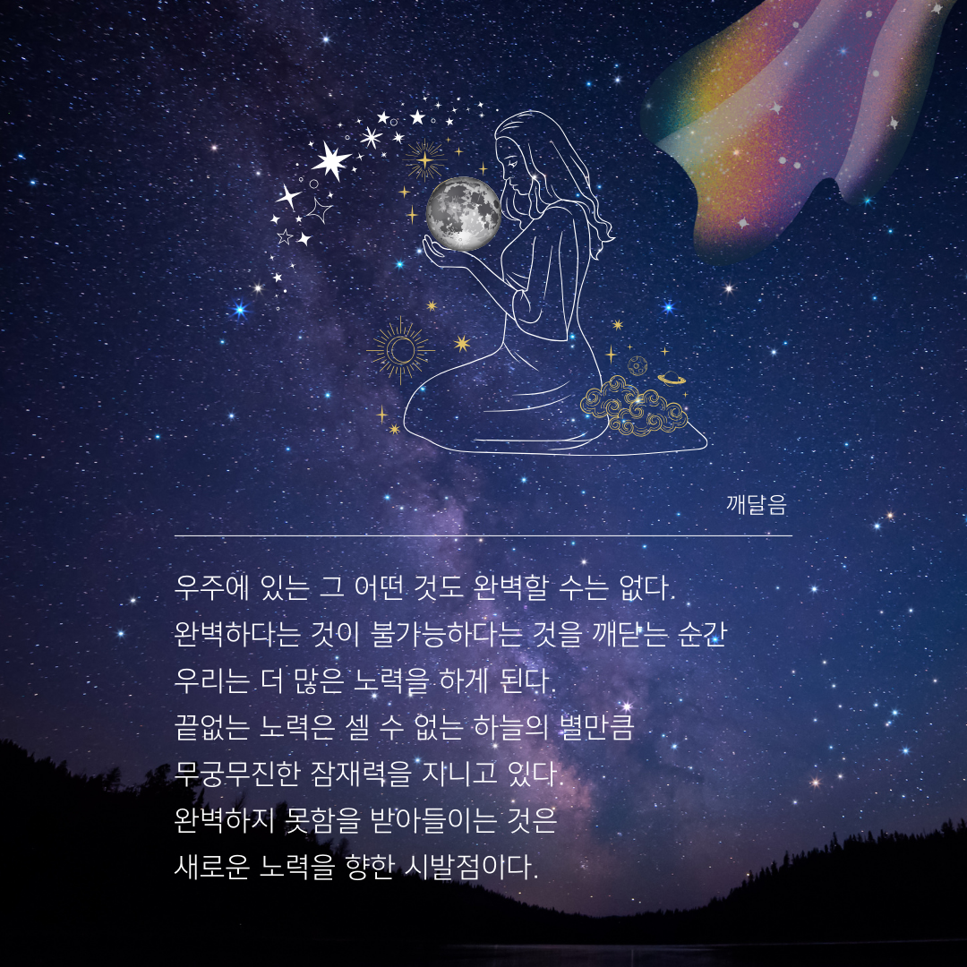 6. 우주에 있는 그 어떤 것도 완벽할 수는 없다. 완벽하다는 것이 불가능하다는 것을 깨닫는 순간 우리는 더 많은 노력을 하게 된다. 끝없는 노력은 셀 수 없는 하늘의 별만큼 무궁무진한 잠재력을 지니고 있다.