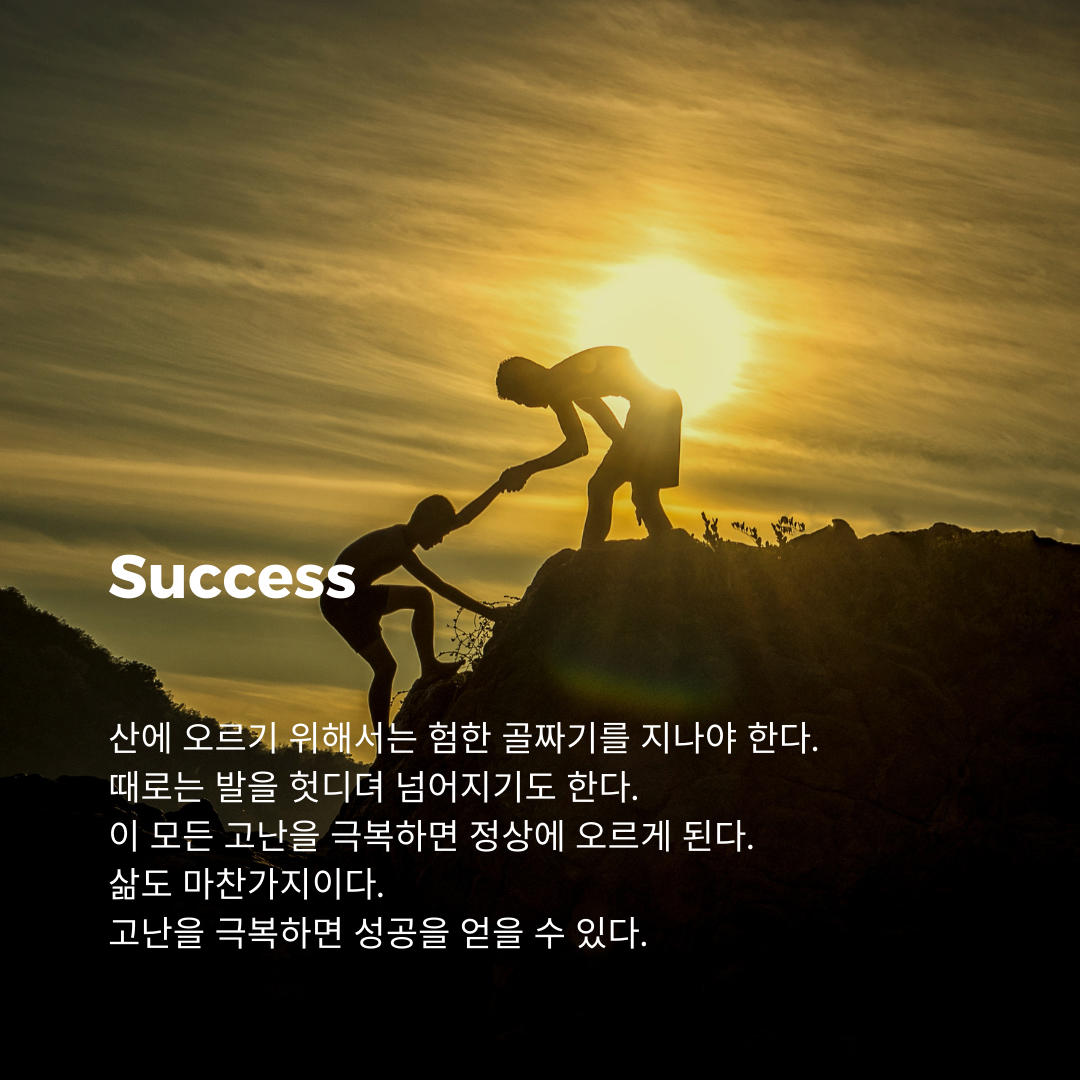 7. 산에 오르기 위해서는 험한 골짜기를 지나야 한다. 때로는 발을 헛디뎌 넘어지기도 한다. 이 모든 고난을 극복하면 정상에 오르게 된다. 삶도 마찬가지이다. 고난을 극복하면 성공을 얻을 수 있다.