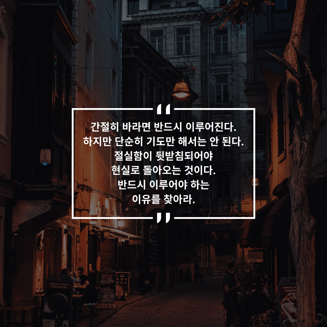 8. 간절히 바라면 반드시 이루어진다. 하지만 단순히 기도만 해서는 안 된다. 절실함이 뒷받침되어야 현실로 돌아오는 것이다. 반드시 이루어야 하는 이유를 찾아라.