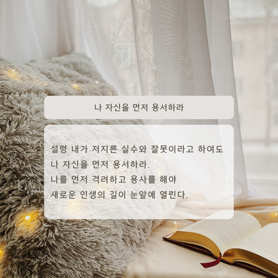 - 나 자신을 먼저 용서하라 설령 내가 저지른 실수와 잘못이라고 하여도 나 자신을 먼저 용서하라. 나를 먼저 격려하고 용사를 해야 새로운 인생의 길이 눈앞에 열린다.