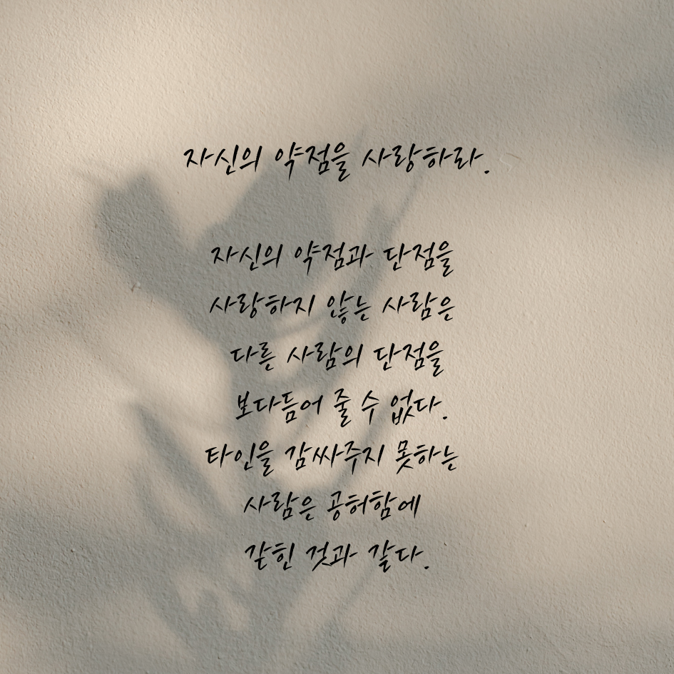 - 자신의 약점과 단점을 사랑하지 않는 사람은 다른 사람의 단점을 보듬어 줄 수 없다. 타인을 감싸주지 못하는 사람은 공허함에 갇힌 것과 같다.