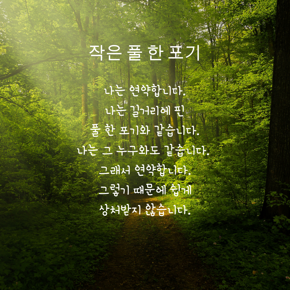 1. 나는 연약합니다. 나는 길거리에 핀 풀 한 포기와 같습니다. 나는 그 누구와도 같습니다. 그래서 연약합니다. 그렇기 때문에 쉽게 상처받지 않습니다.