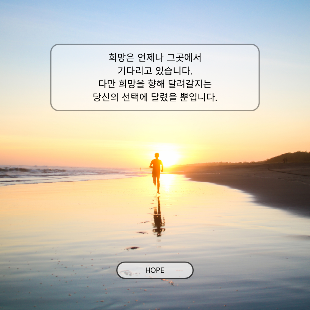 10. 희망은 언제나 그곳에서 기다리고 있습니다. 다만 희망을 향해 달려갈지는 당신의 선택에 달렸을 뿐입니다.