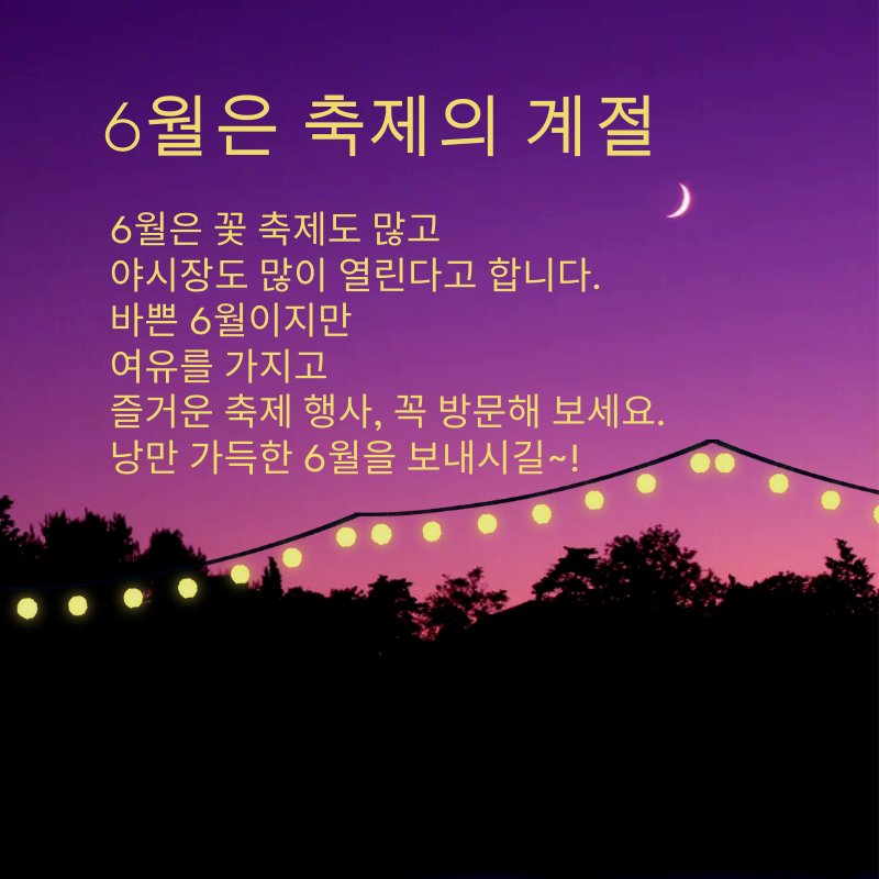 7. 6월은 꽃 축제도 많고 야시장도 많이 열린다고 합니다. 바쁜 6월이지만 여유를 가지고 즐거운 축제 행사, 꼭 방문해 보세요. 낭만 가득한 6월을 보내시길~!