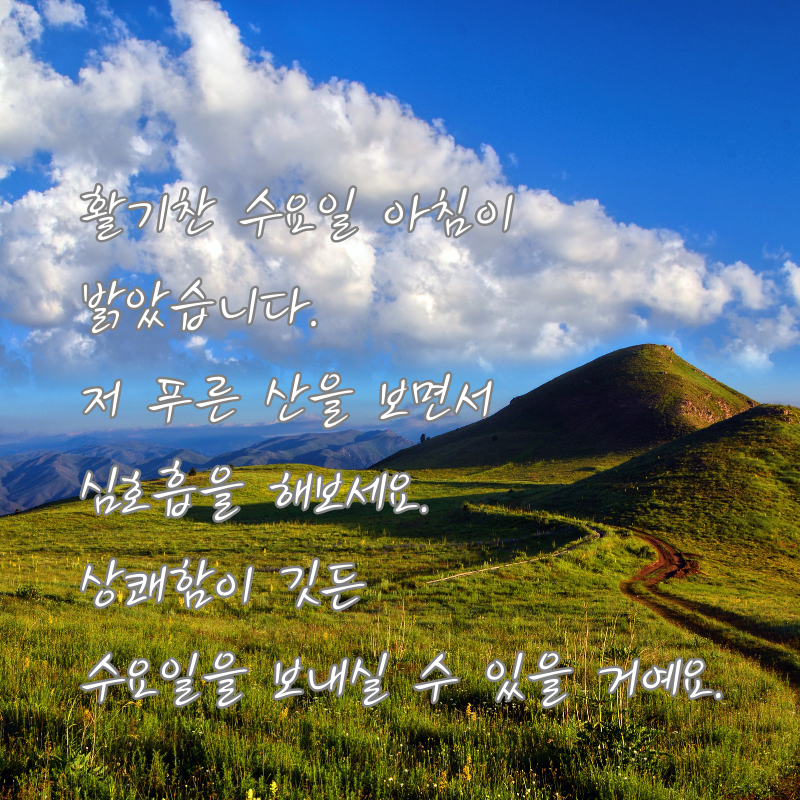 10. 활기찬 수요일 아침이 밝았습니다. 저 푸른 산을 보면서 심호흡을 해보세요. 상쾌함이 깃든 수요일을 보내실 수 있을 거예요.