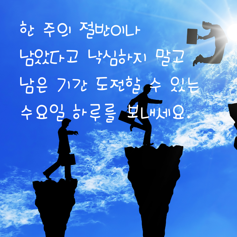 1. 한 주의 절반이나 남았다고 낙심하지 말고 남은 기간 도전할 수 있는 수요일 하루를 보내세요.