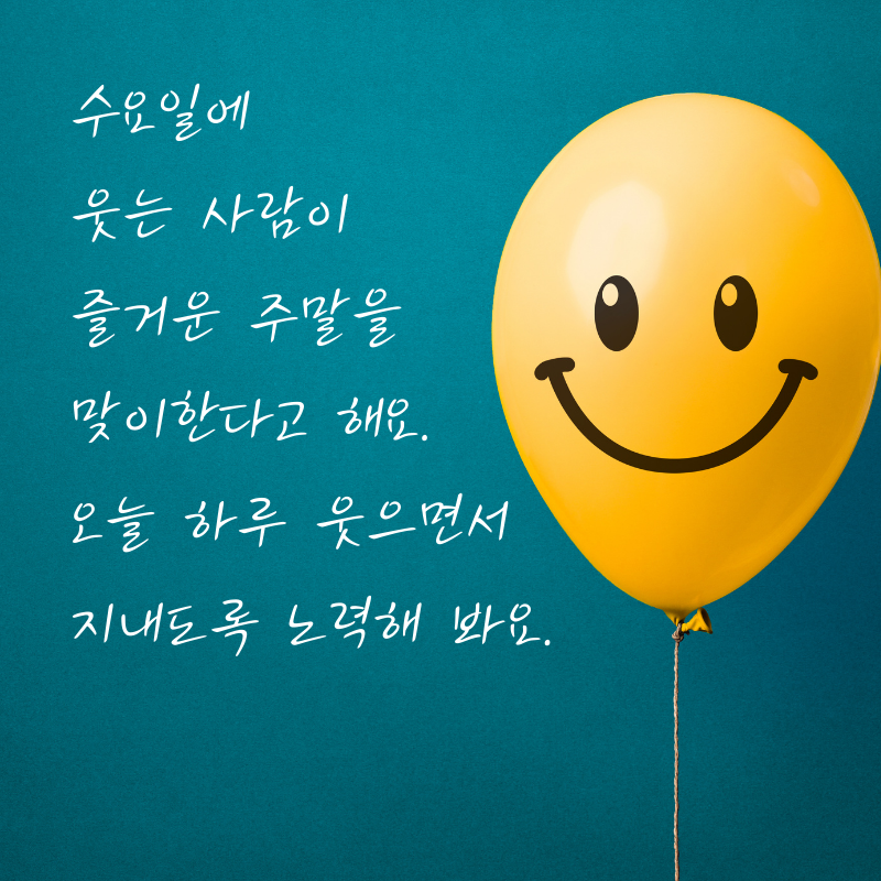 6. 수요일에 웃는 사람이 즐거운 주말을 맞이한다고 해요. 오늘 하루 웃으면서 지내도록 노력해 봐요.