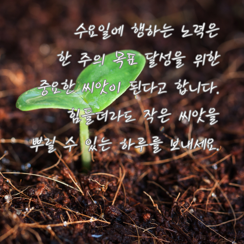 8. 수요일에 행하는 노력은 한 주의 목표 달성을 위한 중요한 씨앗이 된다고 합니다. 힘들더라도 작은 씨앗을 뿌릴 수 있는 하루를 보내세요