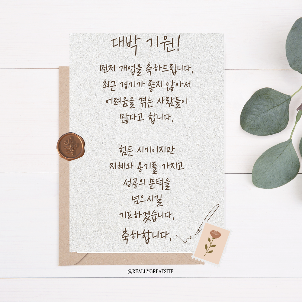 2. 먼저 개업을 축하드립니다. 최근 경기가 좋지 않아서 어려움을 겪는 사람들이 많다고 합니다. 힘든 시기이지만 지혜와 용기를 가지고 성공의 문턱을 넘으시길 기도하겠습니다.