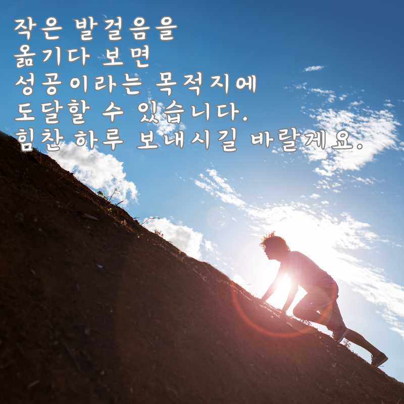 8. 작은 발걸음을 옮기다 보면 성공이라는 목적지에 도달할 수 있습니다. 힘찬 하루 보내시길 바랄게요.