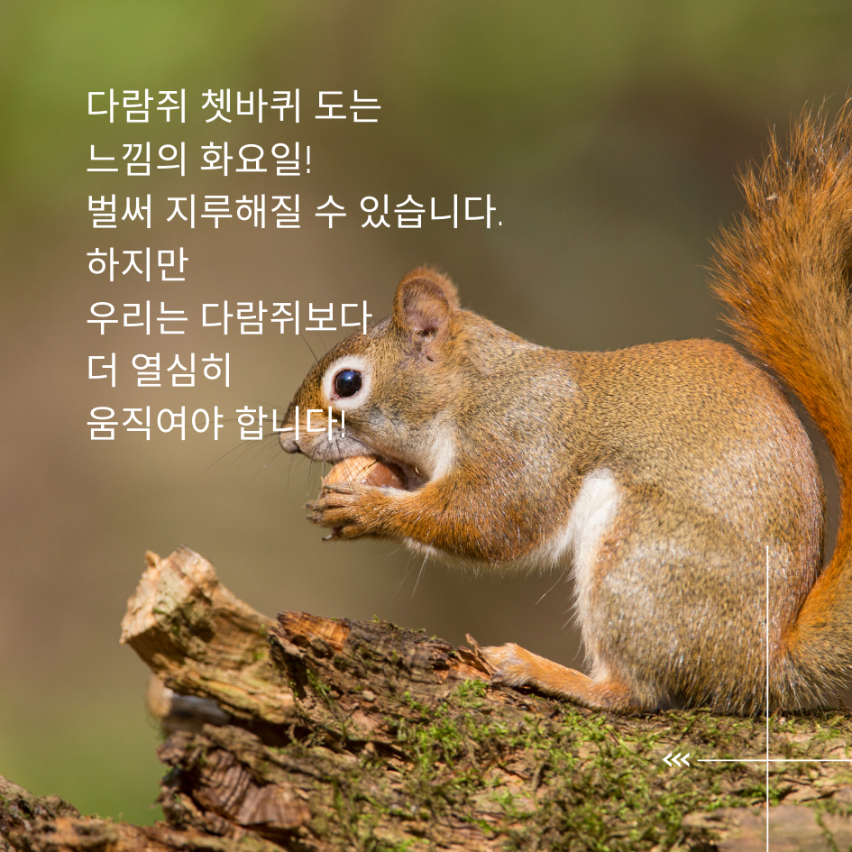 9. 다람쥐 쳇바퀴 도는 느낌의 화요일! 벌써 지루해질 수 있습니다. 하지만 우리는 다람쥐보다 더 열심히 움직여야 합니다!