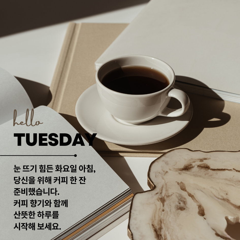 10. 눈 뜨기 힘든 화요일 아침, 당신을 위해 커피 한 잔 준비했습니다. 커피 향기와 함께 산뜻한 하루를 시작해보세요.