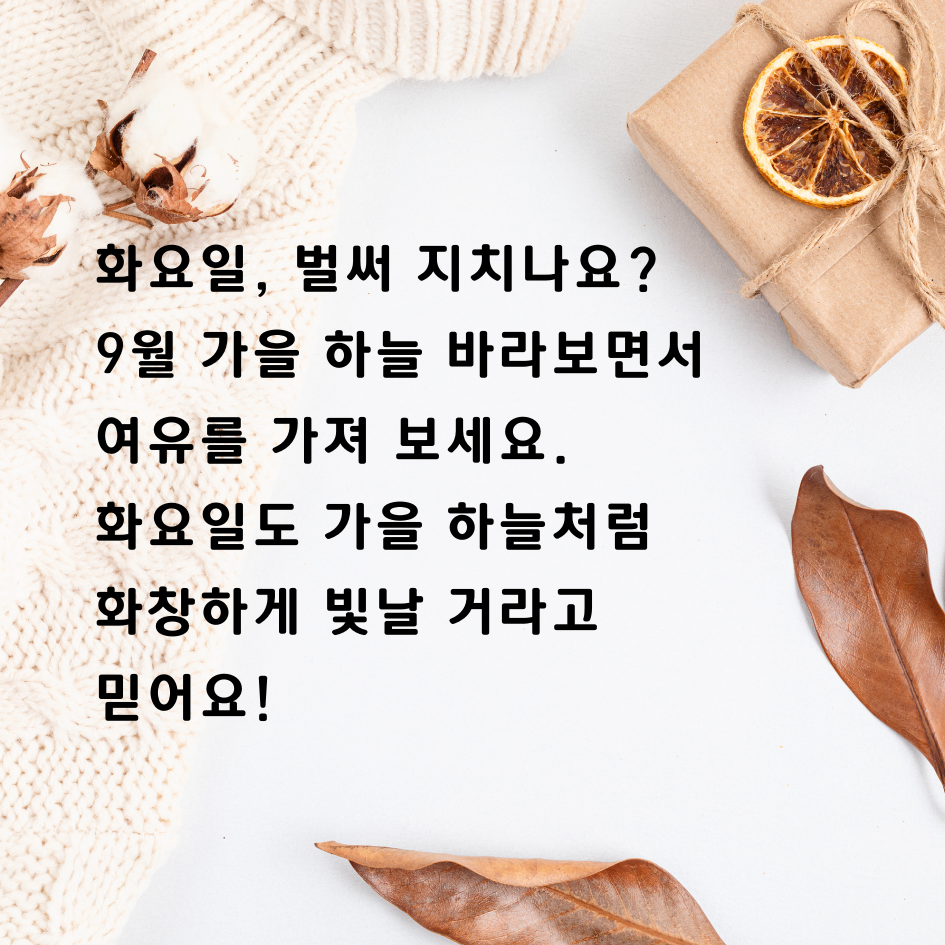9월 가을, 행복하고 즐거운 화요일 아침을 맞이하면 한 주가 더 빠르게 지나갈 거 같습니다~.