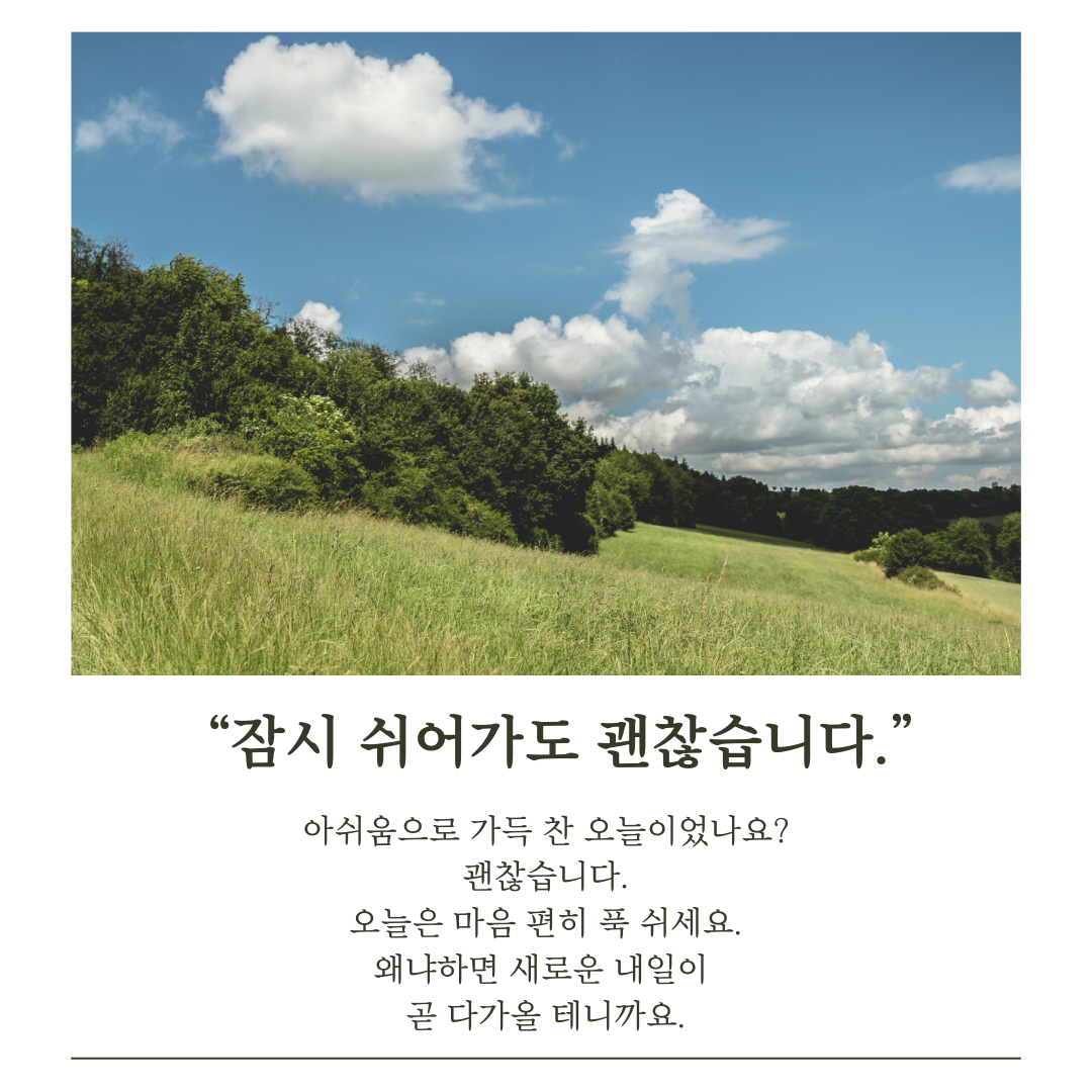9. 잠시 쉬어가도 괜찮습니다. 아쉬움으로 가득 찬 오늘이었나요? 괜찮습니다. 오늘은 모든 것을 다 잊고 편하게 쉬세요. 우리에게는 내일이 있으니까요.