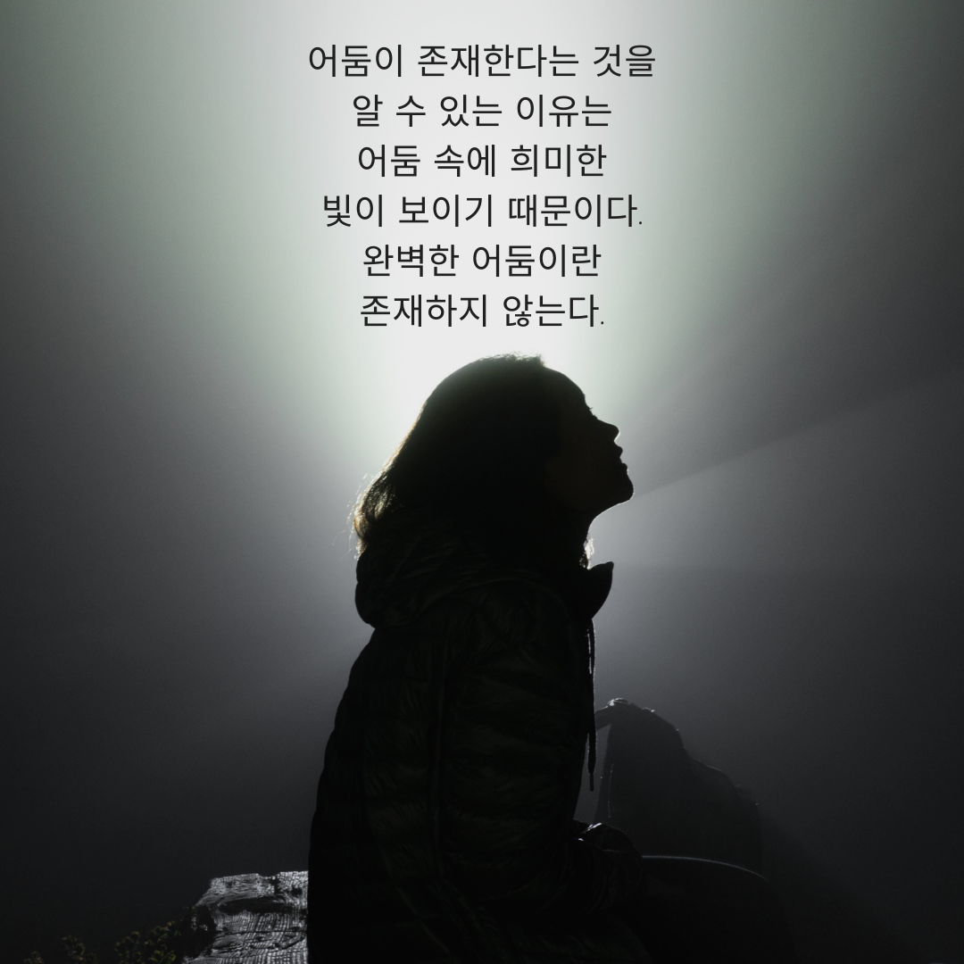 6. 어둠이 존재한다는 것을 알 수 있는 이유는 어둠 속에 희미한 빛이 보이기 때문이다. 완벽한 어둠이란 존재하지 않는다. 우리의 곁에는 항상 희망의 빛이 있습니다. 눈을 뜨고 주변을 잘 살펴보세요.