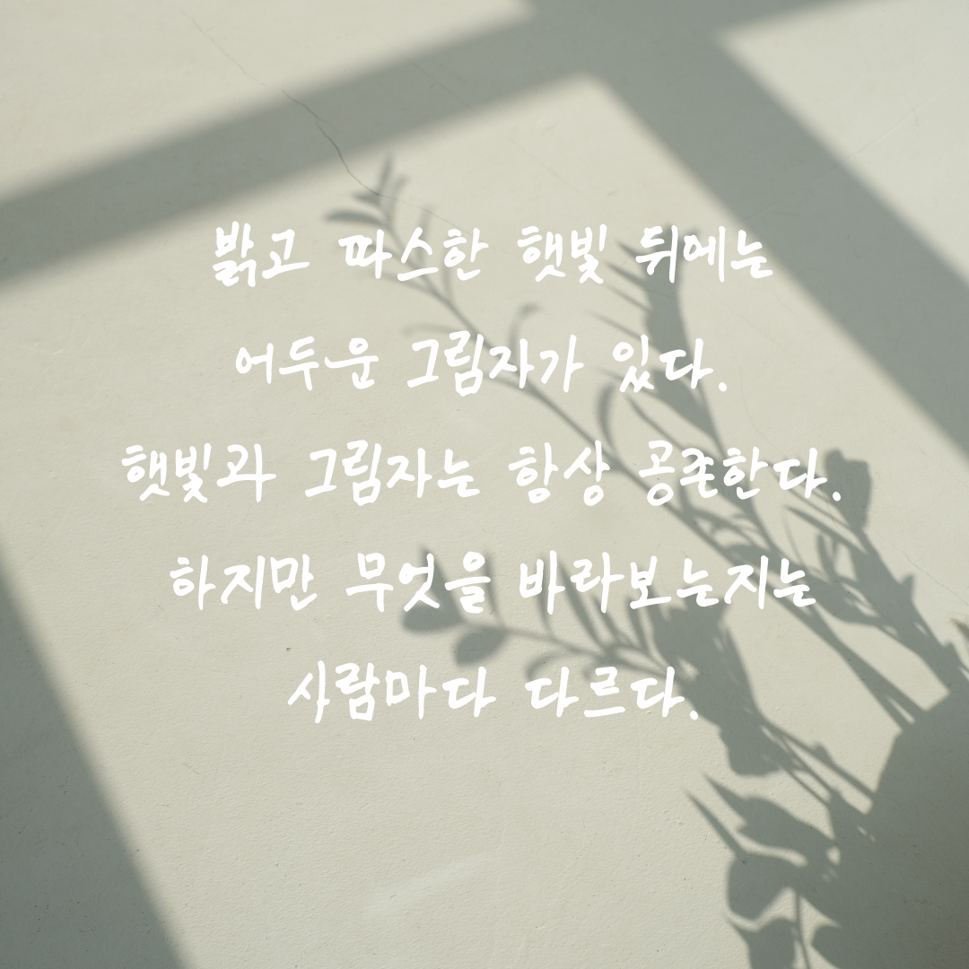 1. 밝고 따스한 햇빛 뒤에는 어두운 그림지가 있습니다. 햇빛과 그림자는 항상 공존합니다. 그러나 희망이 가득 찬 햇빛을 볼지 어두운 기운을 가진 그림자를 볼지는 개개인의 선택에 달렸습니다. 좋은 일과 나쁜 일, 긍정과 부정은 항상 공존합니다. 그리고 어떤 것을 바라보느냐에 따라서 우리의 삶은 서로 다른 길을 걷게 될 것입니다.
