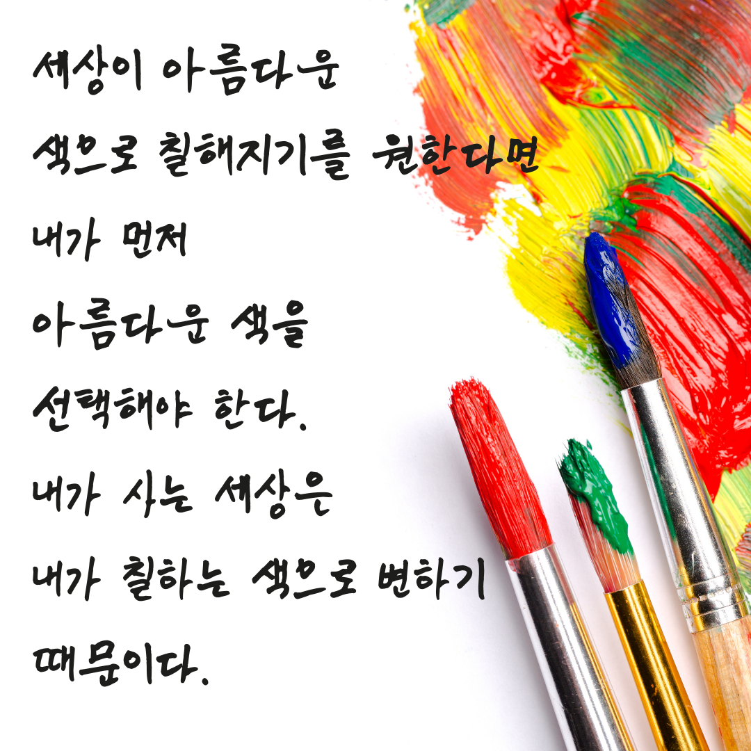 3. 세상이 아름다운 색으로 칠해지기를 원한다면 내가 먼저 아름다운 색을 선택해야 한다. 지난 글에도 잠깐 이야기 하였지만 세상살이에서 발생하는 이벤트는 10%이고 그것을 대응하는 것이 90%라고 합니다. 원하는 삶, 원하는 행복을 얻기 위해서 내가 먼저 좋은 생각과 긍정적인 마음을 가지는 것이 중요합니다.