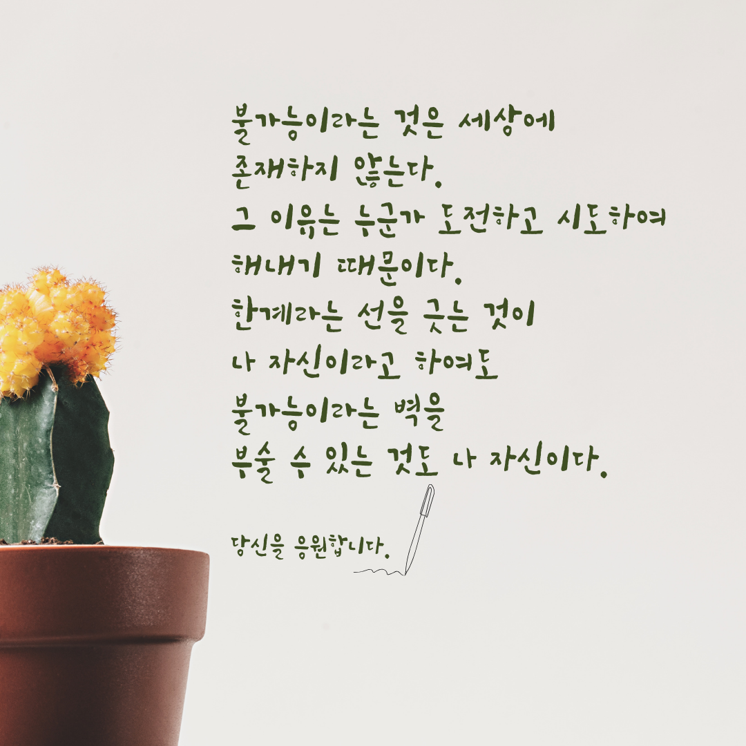 5. 불가능이라는 것은 세상에 존재하지 않는다. 그 이유는 누군가 도전하고 시도하여 해내기 떄문이다. 한계라는 선을 긋는 것이 나 자신이라고 하여도 불가능이라는 벽을 부술 수 있는 것도 나 자신이다. 스스로를 믿고 과감한 도전을 시도해 보세요.