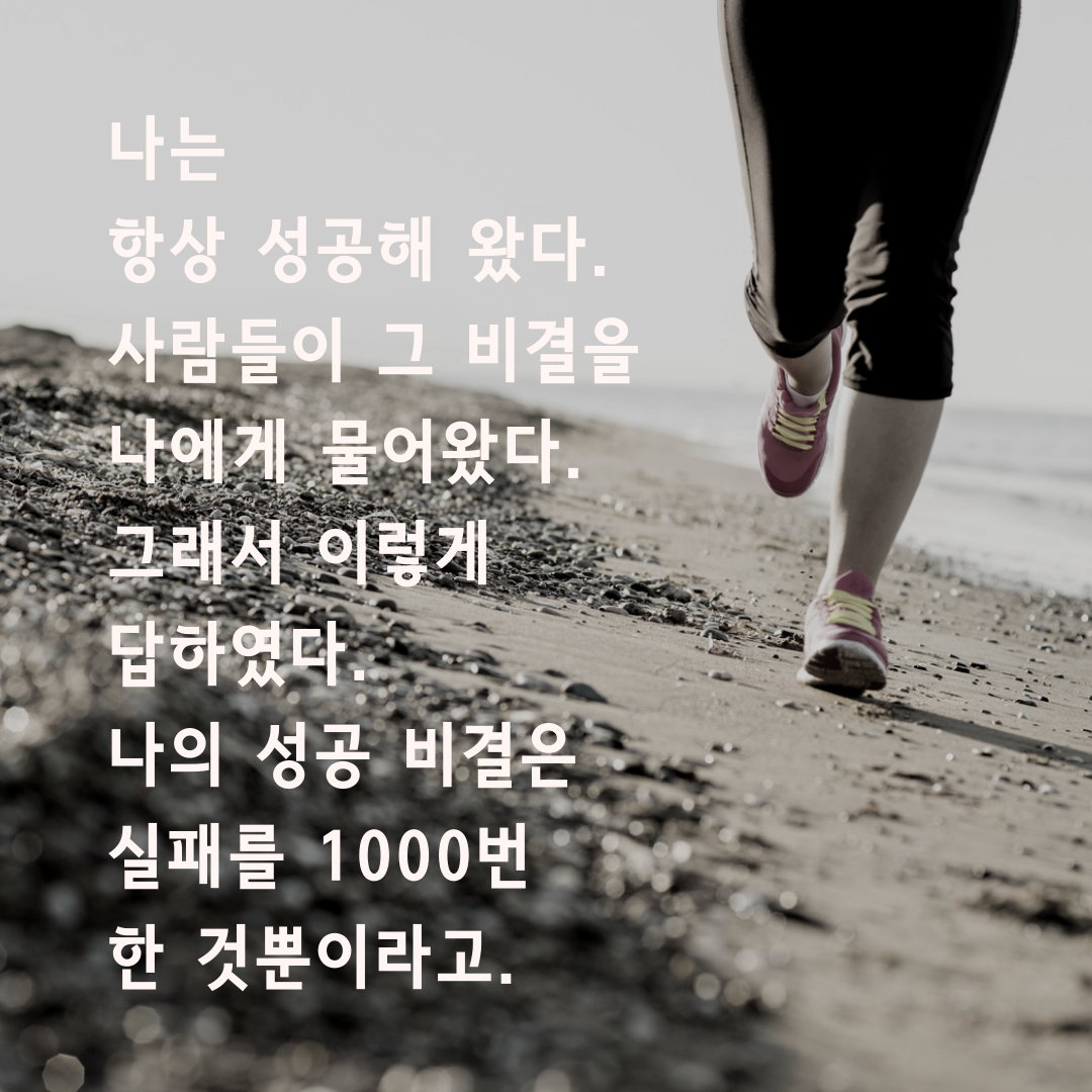10. 나는 항상 성공해 왔다. 사람들이 그 비결을 나에게 물어왔다. 그래서 이렇게 답하였다. 나의 성공 비결은 실패를 1000번 한 것뿐이라고. 성공한 사람들도 항상 많은 실패를 겪어 왔을 거예요. 오늘 실패하고 아쉬움이 남더라도 계속해서 도전해 보세요.