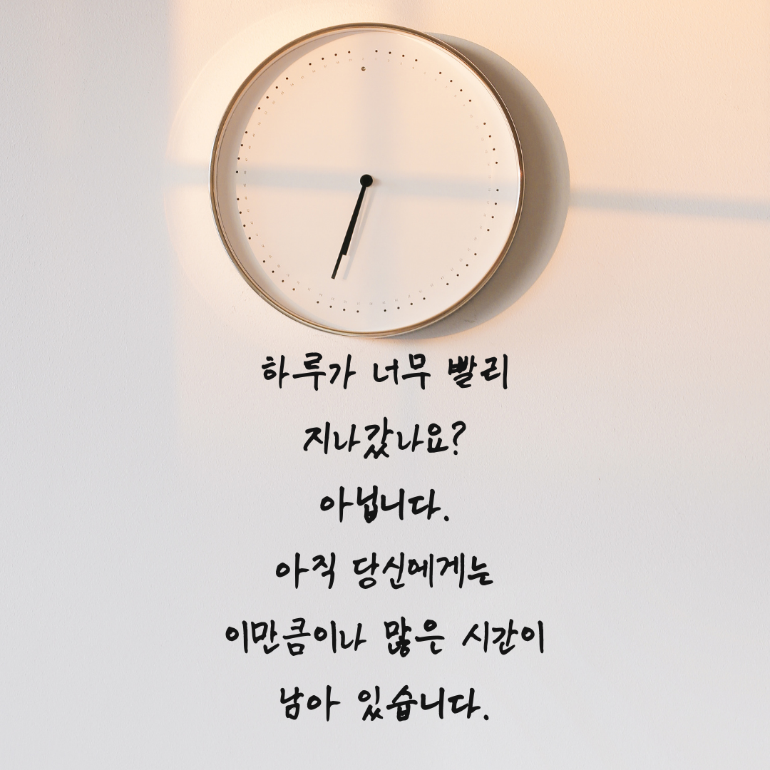 7. 하루가 너무 빨리 지나갔나요? 아닙니다. 아직 당신에게는 이만큼이나 많은 시간이 남아 있습니다. 늦었다고 생각할 때 다시 시계를 바라보세요. 우리에게는 아직 많은 시간과 가능성이 남아 있습니다.