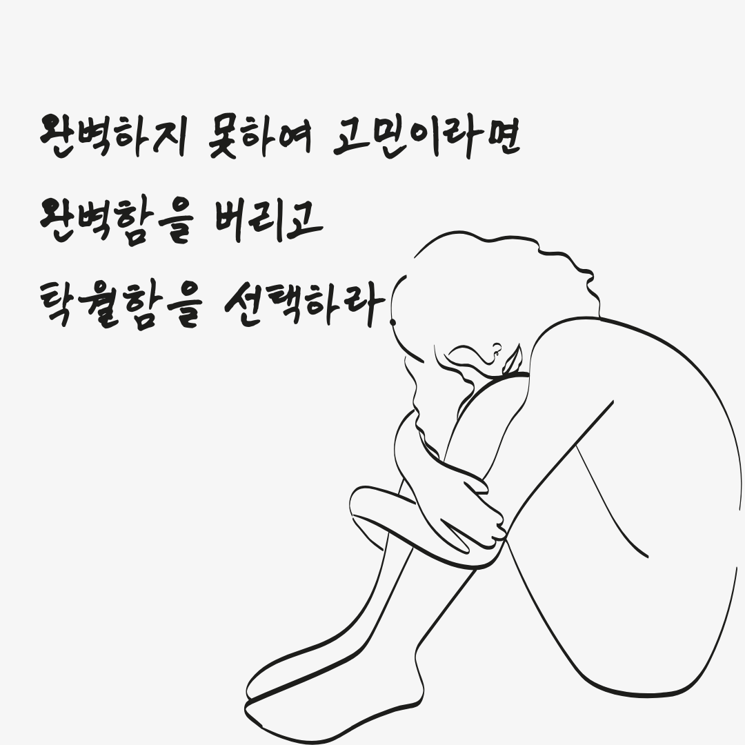 2. 완벽하지 못하여 고민이라면 완벽함을 버리고 탁월함을 선택하라. 완벽함을 추구하면 작은 실수에도 무너지기 쉽습니다. 그리고 완벽하지 못한 자신을 탓하게 됩니다. 만약 완벽하지 못하여 고민이라면 남들 보다 뛰어난 탁월함을 바라보세요. 모든 사람들에게는 저마다 뛰어난 능력이 있기 마련입니다. 완벽하지 않더라도 자신만이 가진 탁월함을 찾는다면 성공의 길로 걸어갈 수 있을 것입니다.