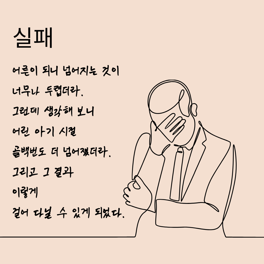 4. 실패. 어른이 되니 넘어지는 것이 너무나 두렵더라. 그런데 생각해 보니 어린 아기 시절 골백번도 더 넘어졌더라. 그리고 그 결과 이렇게 걸어 다닐 수 있게 되었다. 누구나 실패하고 넘어지기 마련입니다. 하지만 가만히 생각해 보면 살면서 그런 적이 한두 번이 아니었을 거예요. 지금 우리가 이렇게 살아있는 이유는 과거 많은 실패를 극복했기 때문입니다. 나이가 들고 지위가 바뀌었고 서 있는 위치가 다르더라도 우리는 항상 넘어지고 다시 일어났다는 것을 잊지 마세요.